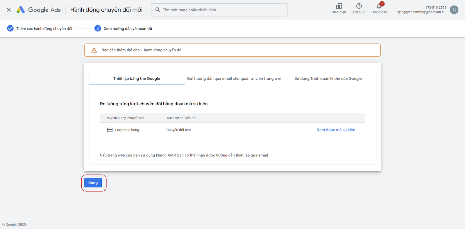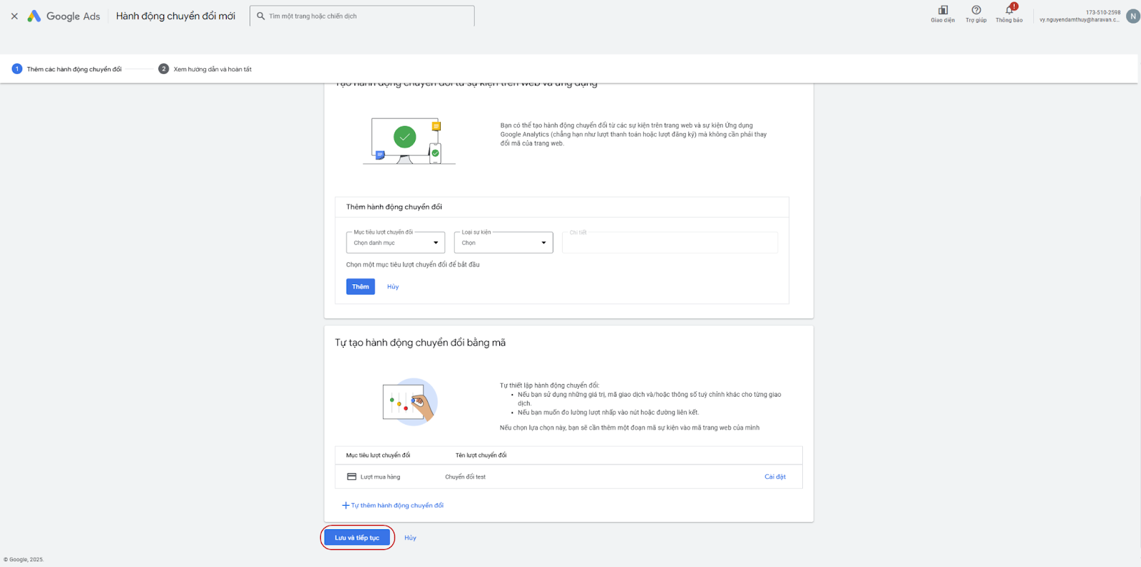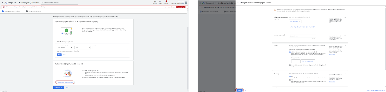 - Thiết lập tạo hành động chuyển đổi bằng mã và nhập các thông tin về hành động chuyển đổi -> Chọn Xong