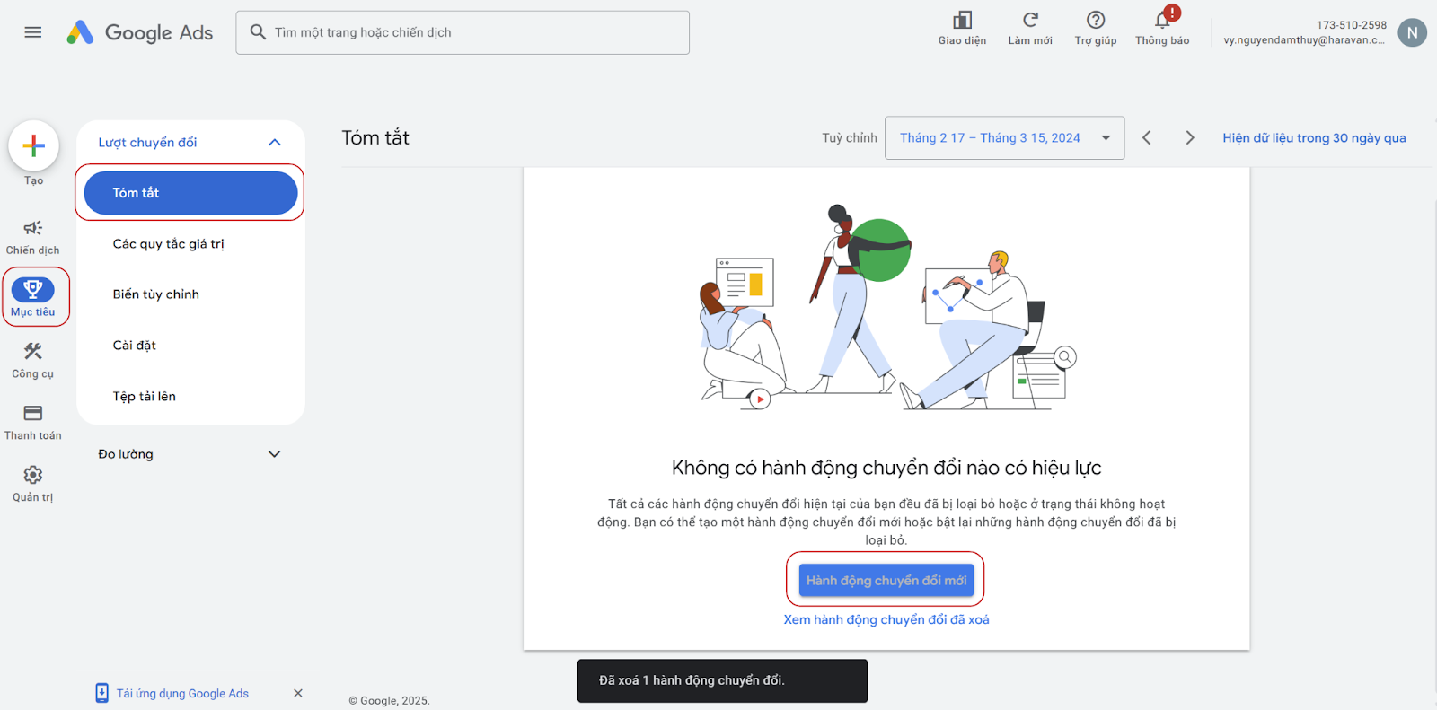 - Trên trang quản trị Google Ads, bạn vào Mục tiêu -> Tóm Tắt -> chọn Hành động chuyển đổi