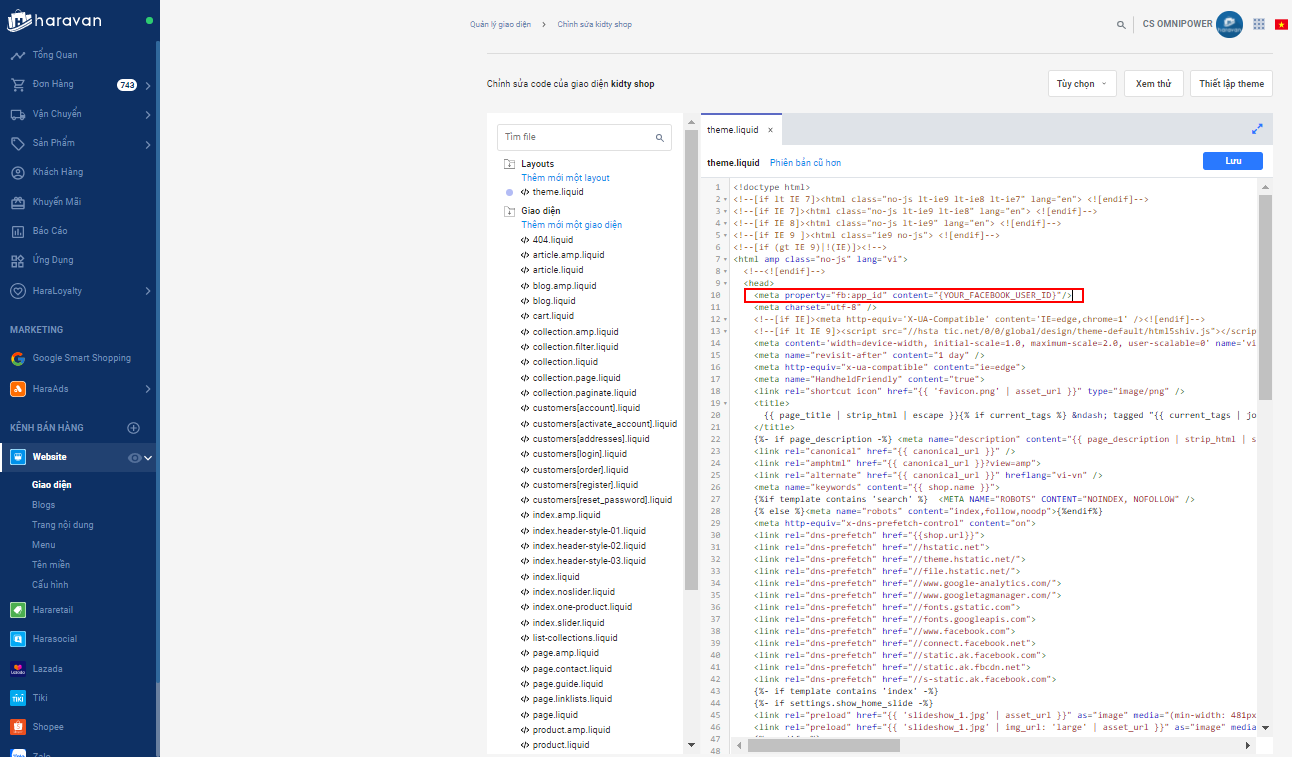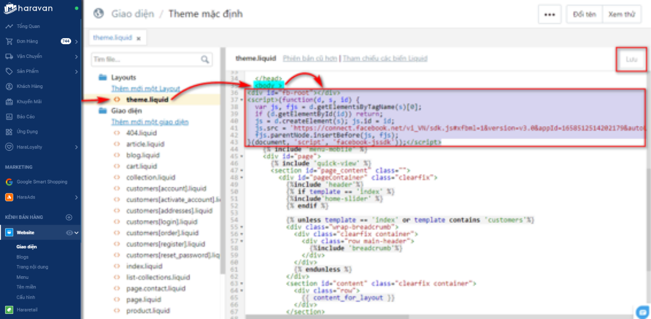 Nhà bán hàng tìm file theme.liquid, thêm đoạn mã JavaScript SDK trong ô Step 2 vào sau thẻ body.