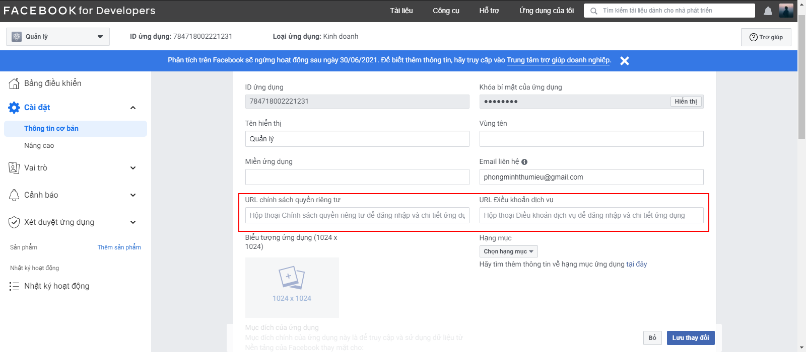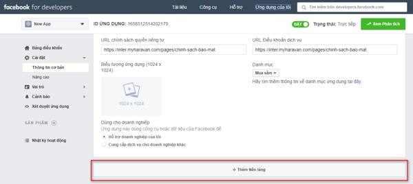 Tại đây, Nhà bán hàng nhập đường dẫn chính sách bảo mật của trang web và chọn danh mục cho ứng dụng. Chọn Lưu thay đổi.