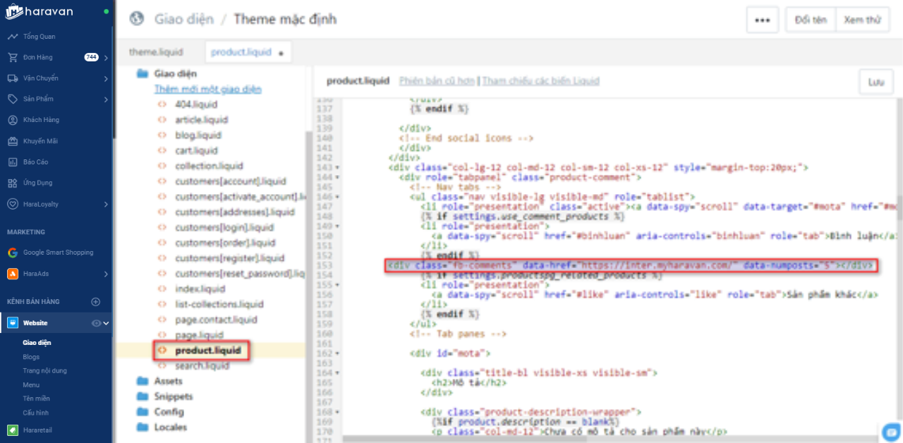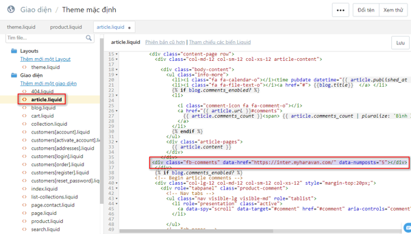 - Đối với các giao diện đã cài đặt quản lý bình luận facebook, Nhà bán hàng chỉ cần Tạo và tích hợp ứng dụng, và thay đổi các đoạn mã tương ứng ở theme.liquid, product.liquid hay article.liquid.