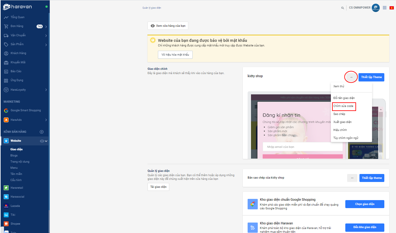 Nhà bán hàng vào Trang quản trị -> Website -> Giao diện -> Chỉnh sửa code.